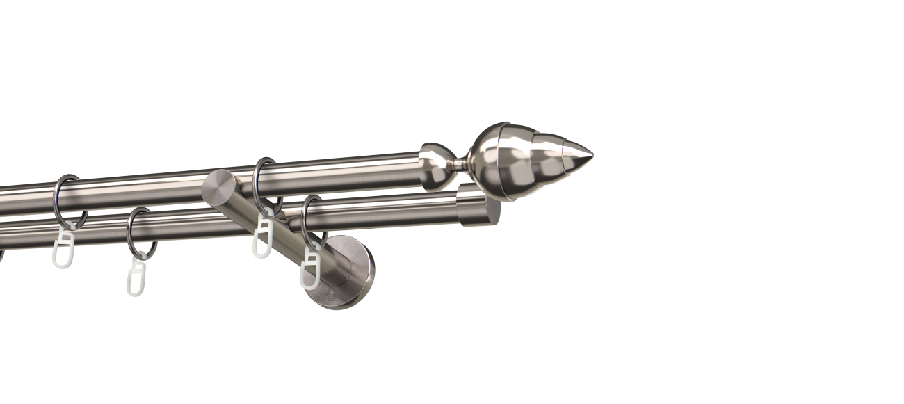 - Karnisze metalowe podwójne dostępne są z dużą ilością zakończeń metalowych oraz szklanych w szerokiej gamie kolorystycznej.